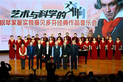 科学与艺术,不是两条平行线。翟实指尖下的贝多芬作品,是艺术家用音符对人性、命运与宇宙的哲思表达——《悲怆奏鸣曲》里的节奏跌宕,恰似科研路上对未知难题的攻坚与突破。翟实带领他的学生艾廪实协奏演绎的双钢琴《C小调第三钢琴协奏曲》的细腻旋律,如同科学家在实验室里对微观世界的温柔探索。科研工作者们在实验室中解构物质的本质、探寻宇宙的规律时,正是在用数据与公式书写自然的“乐谱”,二者都以各自的方式追问世界、表达真理。